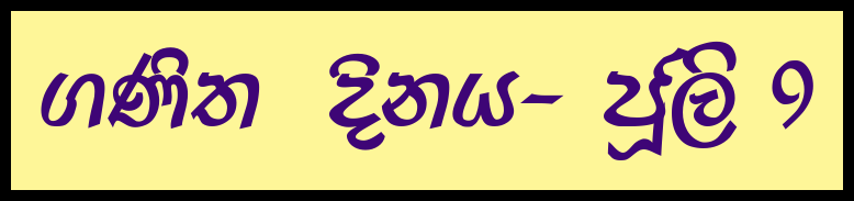 ගණිත දිනයට පැමිනීම සඳහා දෙනු ලබන තෑගි ලබා ගනිමින්. ![]() | ![]() | කෙටියෙන් හෝ තවත් ගණිත දිනයක් විවිධ බාධක මැද නිම කිරීමට හැකිවීම ගැන සතුටු විය හැක. ඉදිරියේ පැවැත්වීමට නියමිත මධ්යවාර පරික්ෂණය අභිමුව මේ සඳහා අවසර දුන් අප පරිවේණාධිපති නාහිමියන්ටද, | තම විෂය පථය අතැර මෙම දිනය සැමරීමට සහය දුන් ගුරු භවතුන් ද,ලකුණු දැමීමෙන් සහය දුන් ලලිත් ගුරුතුමන්ට ද ,මාගේ ඉල්ලීම මැද දුර සිට පැමිණ උදව් දුන් අපගේ පැරණි සගයා වන සුරාජ් රුශෙප්රි ගුරුතුමන්ට ද මාගේ ගෞරව පූර්වක ස්තුතිය. | ||||||||||